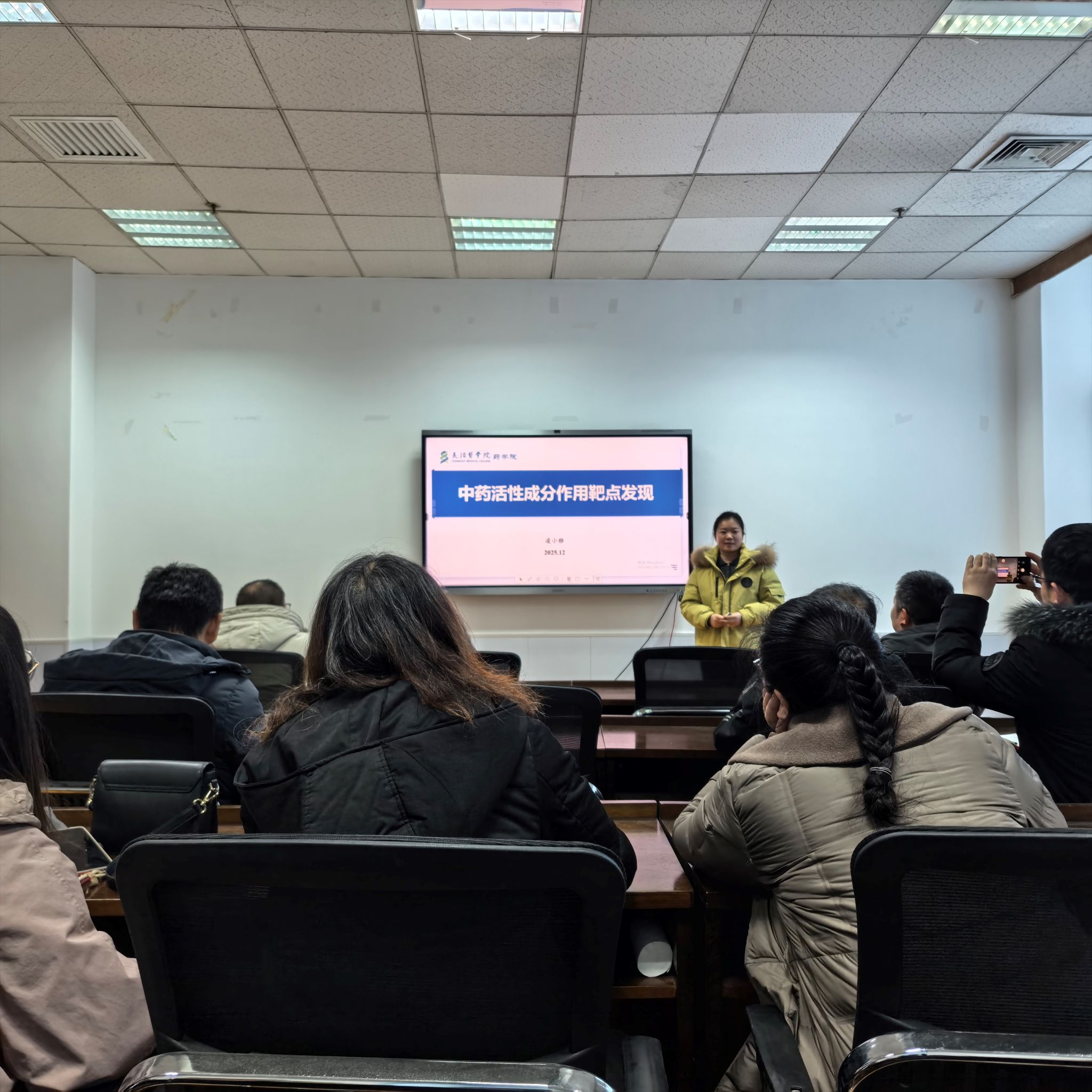 学术交流环节由免疫靶向药党支部凌小雅博士主讲,题为《中药活性成分作用靶点发现》。她系统介绍了该领域的技术进展,并详细分享了其在苦参碱抗病毒作用分子机制方面的前沿研究成果,展示了学院在中药现代化研究中的扎实探索。